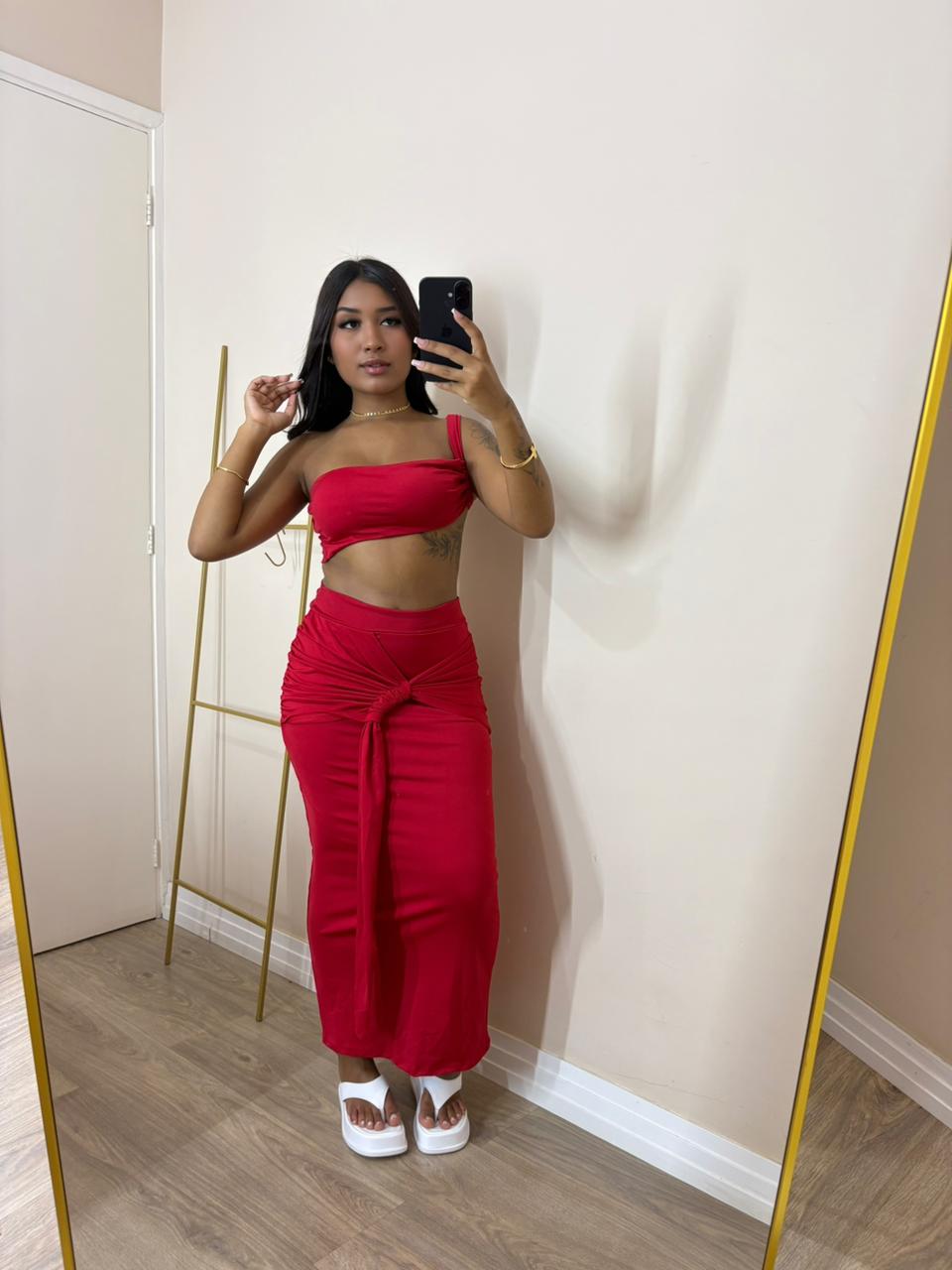 CONJUNTO PARIS, vem no tecido poliamida com elastano. Cropped vem com alça lateral e ajuste. Saia vem com detalhe torcido frontal.