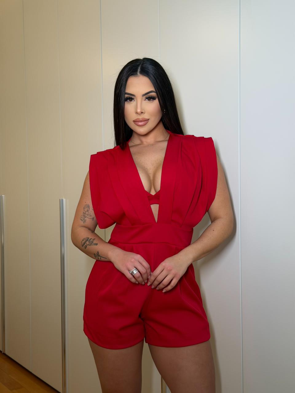 MACAQUINHO RAVENA, Vem no tecido alfaiataria, com recorte frontal, detalhe plissado, amarração no pescoço e acompanha top basic.