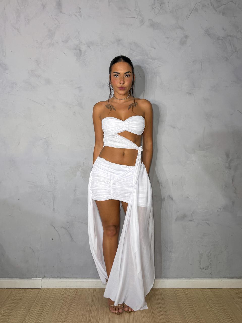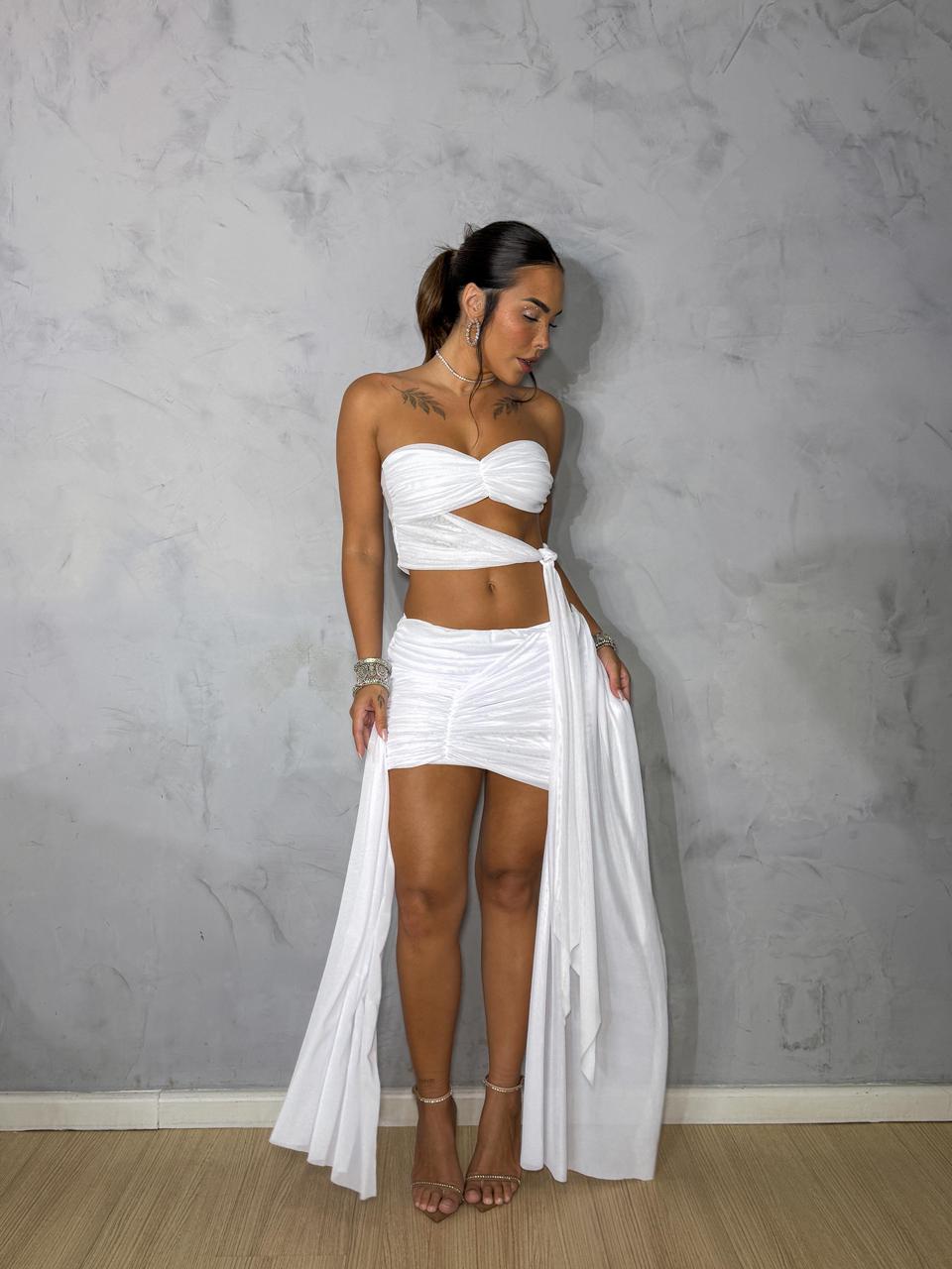 SAIA CLARA, vem no tecido tule fume, possui elastano, elastico na cintura, duplamente forrada no tecido tule, acompanha hot pant, drapeados frontais, laterais e detalhes em lenços laterais.