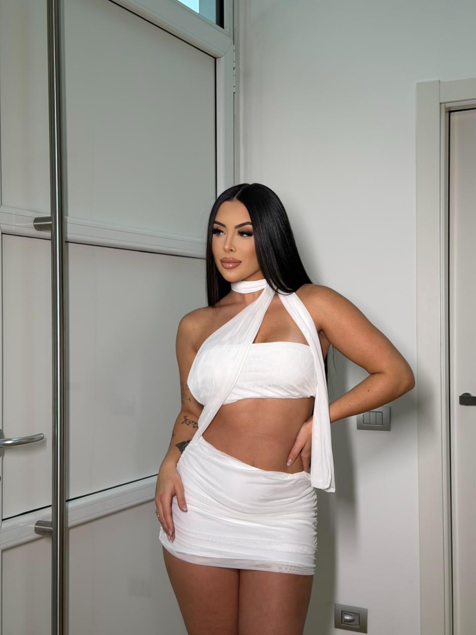 VESTIDO VENEZA, vem no tecido tule fume com elastano, recorte lateral, detalhe em lenço para fazer diversas amarrações e drapeados laterais.