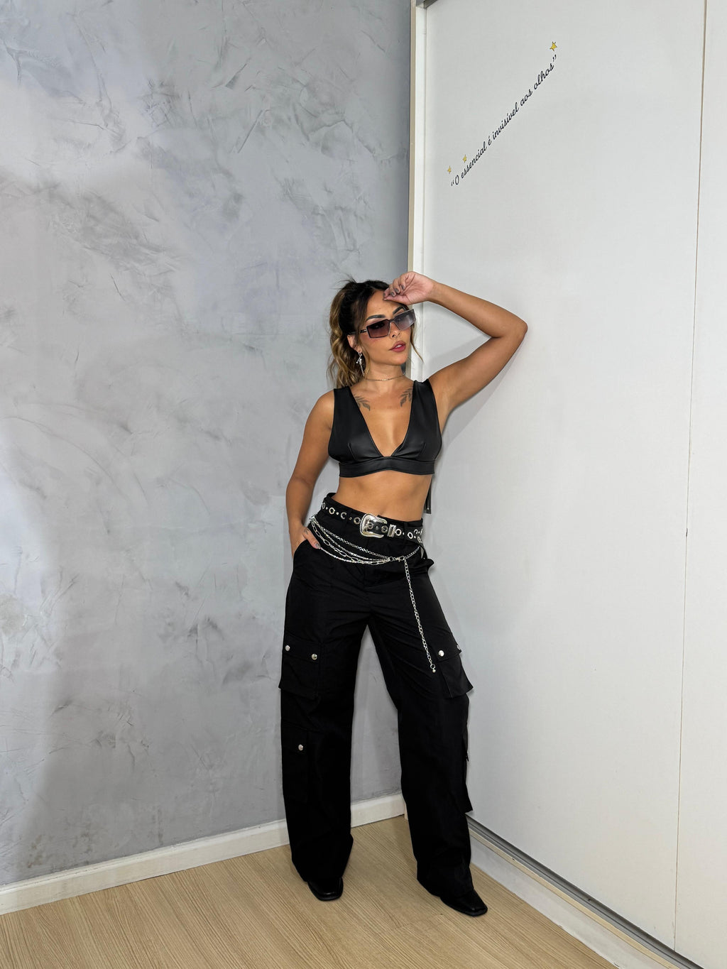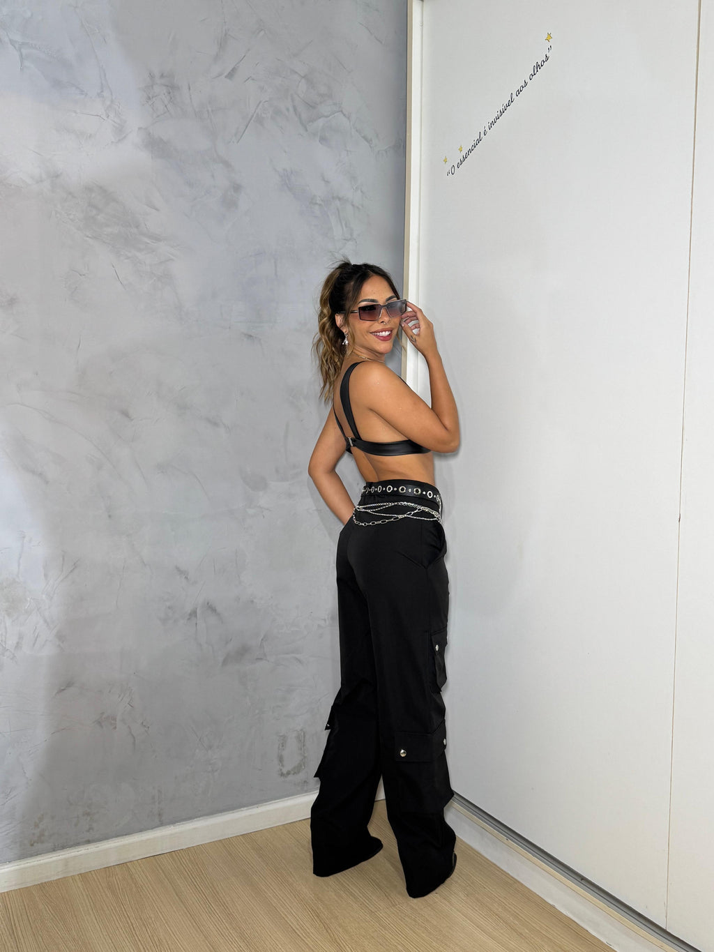 A nossa calça cargo vem no tecido de poliester com elastano, nos tamanhos P M G, detalhe em bolsos cargos laterais e botões metalizados.