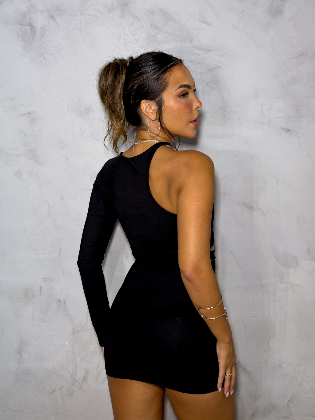 O vestido Berlim vem no tecido suplex, com detalhe en recortes frontais e duplamente forrado no busto.