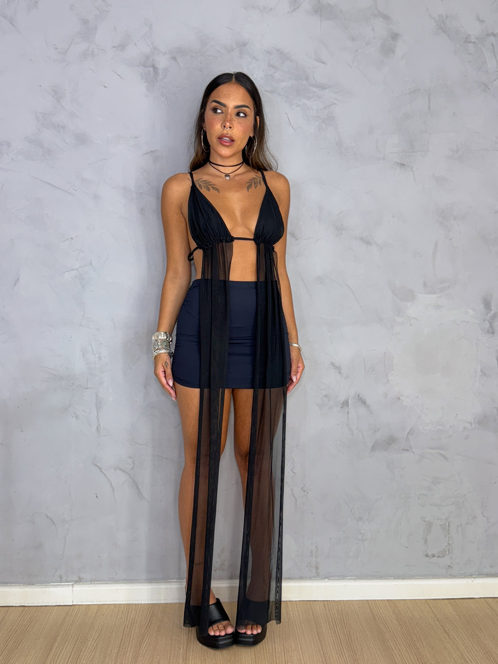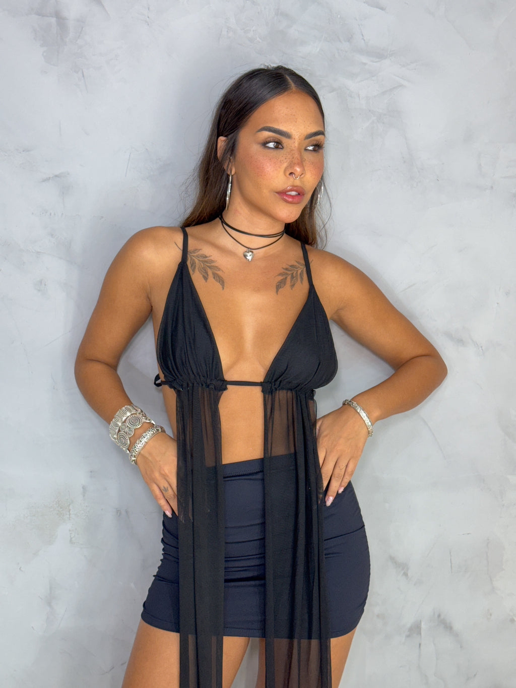 O cropped Scarlart vem na composição do tecido poliamida no busto, com o tecido de tule, no estilo cortininha ajustando conforme o tamanho do seu busto.