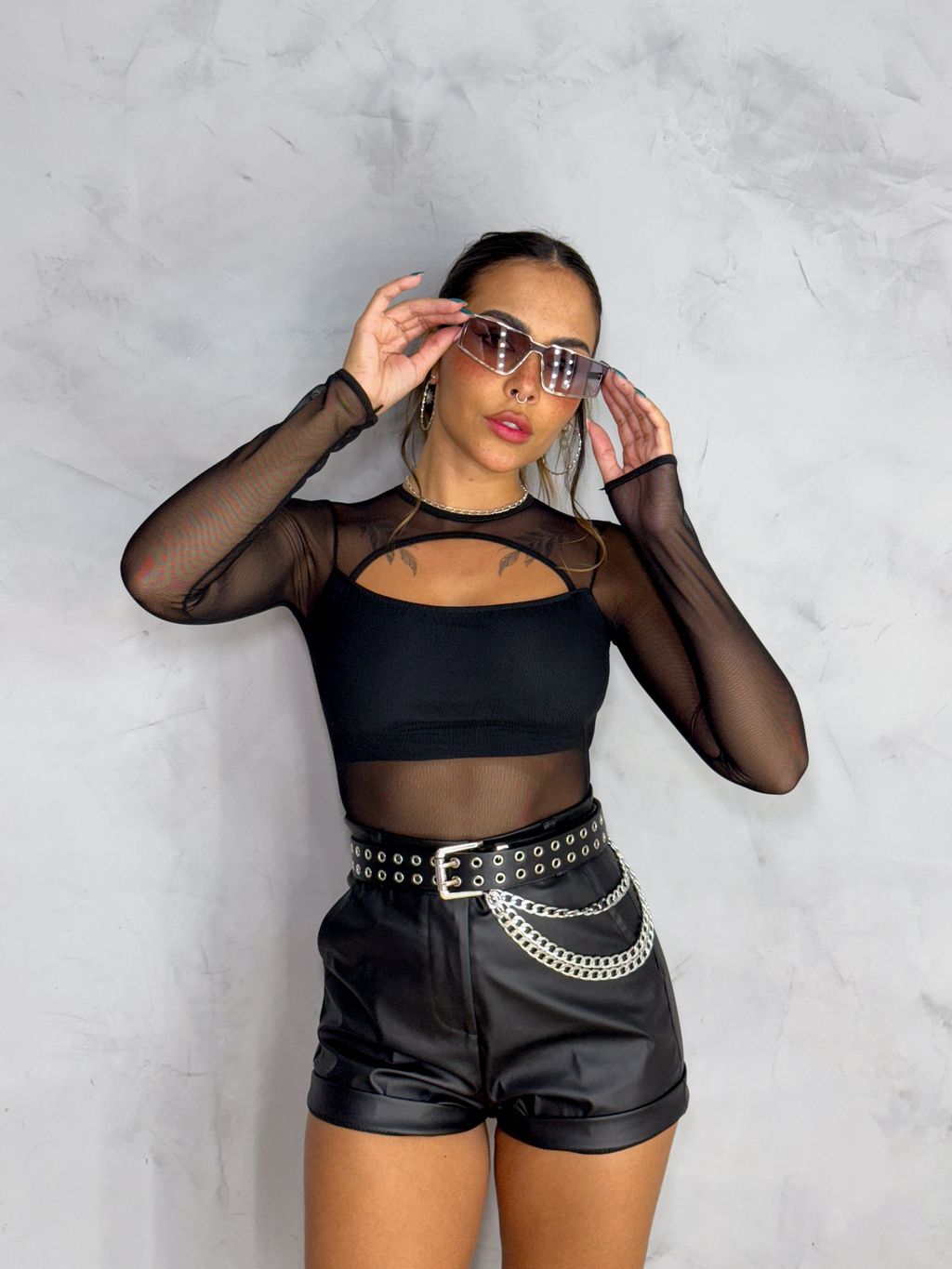 Body de tule com top costurado e detalhe com abertura na parte da frente e costas. Super estiloso, sensual e auntêntico.